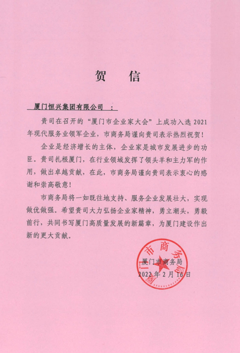 厦门市商务局发来贺信,祝贺厦门明升ms88集团成功入选2021年现代服务业领军企业。