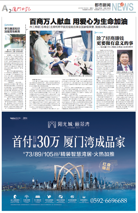 日前,厦门市工商联(总商会)主席柯希平获得“全国无偿献血促进奖特别奖”。据悉,我省获此殊荣的包括他就两位。该奖是由国家卫计委组织,每两年评选一次,是无偿献血事业的国家级荣誉。