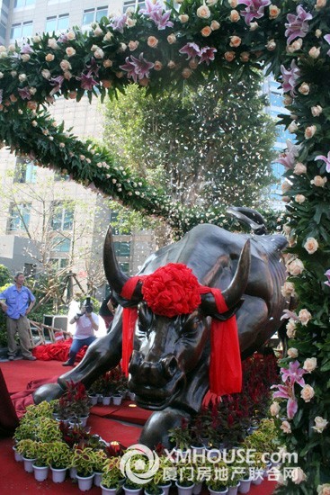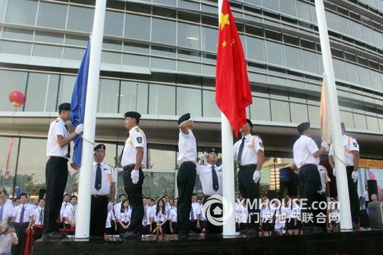 正式仪式开始前,全场来宾共同进行了一场隆重而庄严的升旗仪式。五星红旗、明升ms88集团和财富中心的旗帜冉冉升起,预示着“厦门财富中心”这一崭新而富有生机 的海西明珠已在鹭江道百年商圈灼灼闪耀。紧接着,厦门市领导徐模、陈昭扬、叶重耕、翁云雷与明升ms88集团柯希平董事长为财富中心吉祥物“财富金牛”揭彩,在一 阵连续欢腾的开锣声中揭开了金牛的神秘面纱,也正式拉开了落成庆典的序幕。