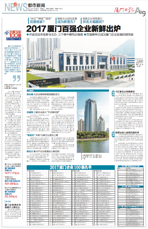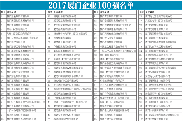 近日,由厦门企业和企业家联合会、厦门日报社、厦门广电集团联合主办,各行业协会协办的“2017厦门企业100强”排序活动,历经2个多月的严格评选,已圆满落幕。2017厦门百强企业排行榜掀开面纱,三个榜中榜——“2017厦门制造业企业十强”排行榜、“2017厦门服务业企业十强”排行榜以及“2017新兴产业专精特新企业十强”排行榜也同步揭晓。